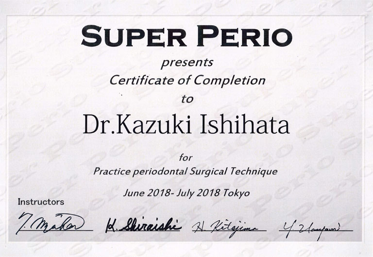 - 明海大学卒後研修(明海大学歯周病科 申教授)ペリオドンタルアドバンスセミナー8日間コース修了